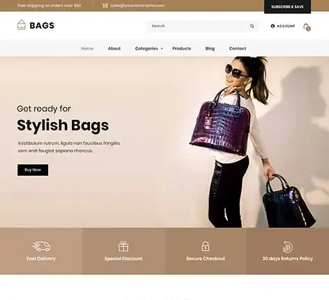 This theme ensures various products are arranged into an online shop by category.